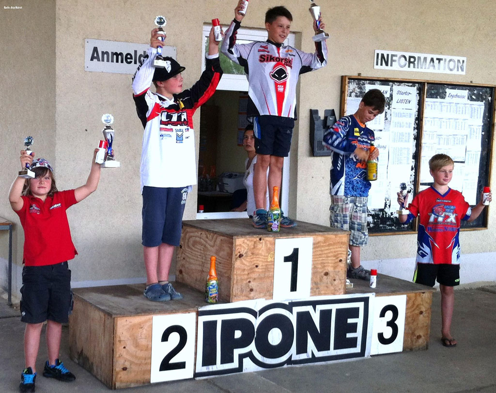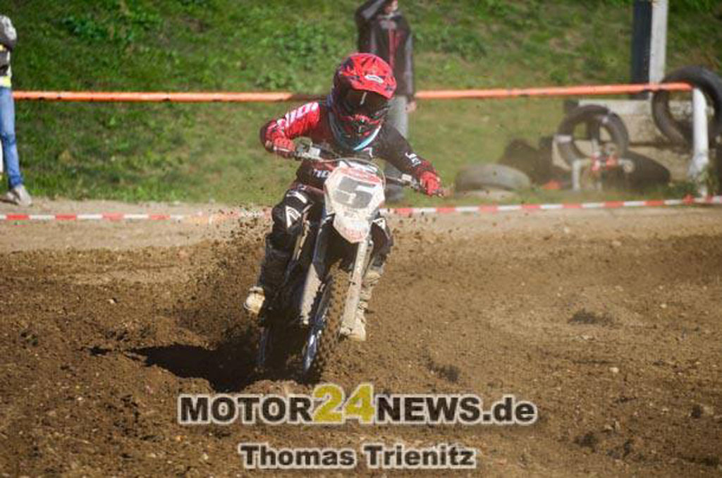 Am Samstag in Thurm zur Sachsenmeisterschaft 65ccm war Falko SEIFERT (#5) nicht 100% belastbar. Hatte er sich beim Training in der Woche leicht am Handgelenk verletzt. Dadurch fuhr er den schnellen Rundenzeiten etwas hinterher. Nach den Trainingsläufen, welche zeitlich nicht optimal ausgefahren wurden, musste er sich mit Startposition 6 zufrieden geben. Der erste Start war ganz gut gelungen und er kam an 4. Stelle ins Ziel. Im zweiten Rennen war der Start nicht so optimal, aber Falko erkämpfte sich trotzdem Platz 6. Das Tagesergebnis war ein sensationeller 5. Platz und somit wieder bester Neueinsteiger in seiner Klasse. Am Samstag geht's dann nach Schwerin zur LVMX 65ccm.Aug 21