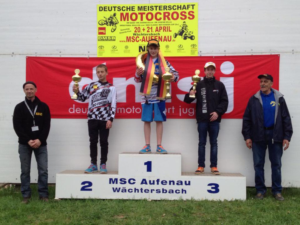 Auch unser Nachwuchs war an diesem Wochenende wieder in Sachen Motocross unterwegs. In Moorgrund (Kotzan) fand am 14.04.2013 auf dem Heiligenberg bei Gumpelstadt wieder die Deutsche Meisterschaft Klasse 65 & 85ccm statt. Erwartet wurden Fahrer aus ganz Deutschland, so war das Startfeld mit 52 Fahrern natürlich sehr groß. Darum ging es auch über ein Halbfinale zum Finallauf. So ein Auftaktrennen ist gerade für den Nachwuchs natürlich besonders spannend, muss man sich doch seinen Platz im Fahrerfeld wieder neu erkämpfen. Hier zeigt sich wie der eigene Trainingsstand nach der langen Pause gegenüber den anderen Fahrern ist und wie sie in Form sind.